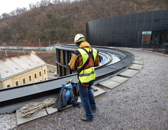 Na objektu „A“ a objektu „B“ zajistit školenému personálu bezpečný výškový přístup k vnějším fasádám za účelem jejich dlouhodobé údržby - systémem lanového přístupu, nebo plošinou pro údržbu opláštění budov (BMU).